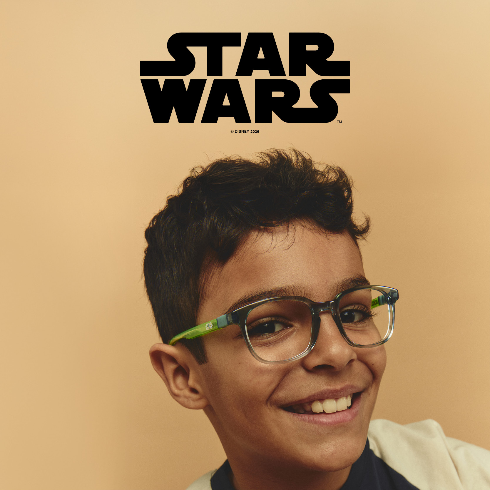 La colección de gafas STAR WARS™ nos transporta al universo de la saga utilizando expresiones famosas, personajes carismáticos o escenarios galácticos de la serie. En ocasiones vestidas con exclusivas placas de acetato, las monturas STAR WARS™ destacan por la calidad de sus acabados y la originalidad de sus detalles.